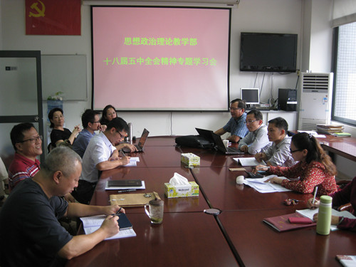 今日下午,思政部全体教职工开会,专题学习党的十八届五中全会精神。肖凤良博士做了专题辅导报告。他从“十二五”成就、十三五时期我国发展环境的基本特征、发展的指导思想、发展理念、发展目标、组织建设的新要求等方面对全会精神进行了全面解读,重点解读创新、协调、绿色、开放、共享的发展理念。通过解读,大家对五中全会的精神有了比较清晰的认识。