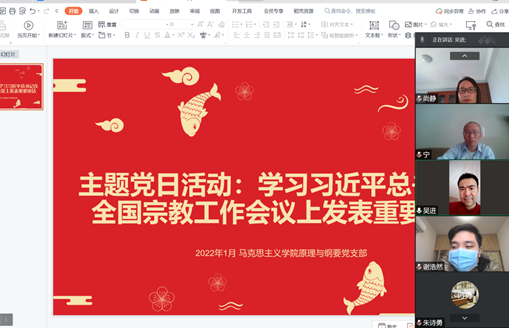 1月27日,马克思主义学院原理与纲要教师党支部在线上开展主题党日活动,学习习近平总书记在全国宗教工作会议上的重要讲话精神,研究贯彻落实意见。会议由支部副书记唐晨诗主持,支部全体党员参加会议。