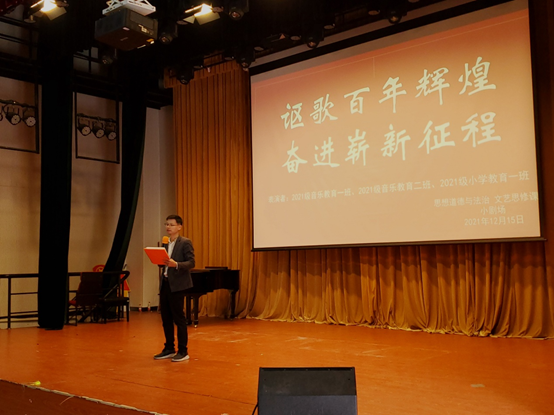 为夯实学习成果,充分发挥思政课在大学生思想政治教育中的主渠道作用,增强思政课的吸引力与感染力,在马克思主义学院的大力支持下,机械工程学院辅导员肖毅老师在他的“思想道德与法治”课堂上,将音乐美育与思修教育有机融合起来。12月15日上午,在肖毅老师的精心指导下,2021级音乐教育一、二班、2021级小学教育一班全体学生在小剧场举办了文艺思修课活动。活动让思修课堂流动起来,极大地增强了思政课的亲和力和针对性。