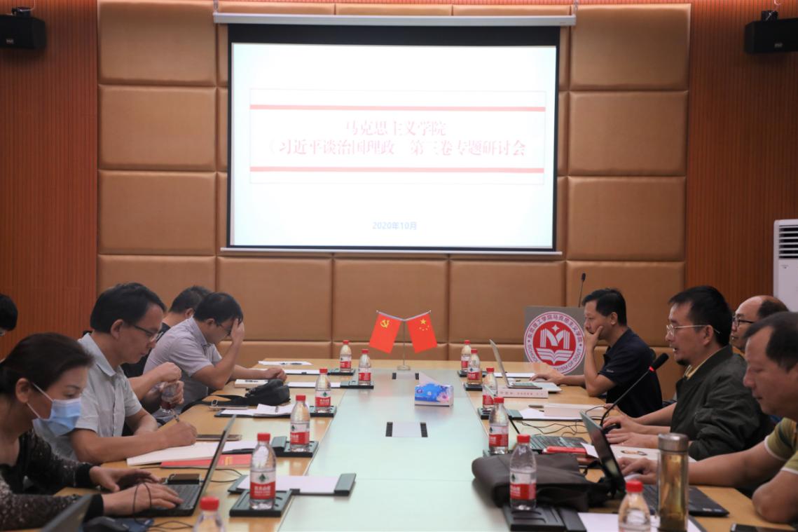 新学期开学以来,马克思主义学院共举行了3场研讨会,与会者各抒己见,从第三卷的形成与来源、内涵与要义、特点与意义等维度进行了深度探讨,并形成了宣讲课件。其中,10月8日,马院教师以主题报告和交流发言的形式,分享了心得体会。研讨会对促进思政课教师深入学习《习近平谈治国理政》第三卷起到良好的作用。老师们表示,将在知行合一、学以致用上下功夫,自觉用党的创新理论武装头脑、指导实践、推动工作。