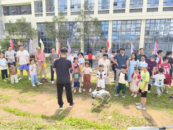 活动现场,10台无人机编队飞行表演和无人机空中烟弹展示精彩开场,瞬间点燃孩子们的热情。紧接着,“穿越机” 闪亮登场,灵活穿梭、快速翻腾,做出各种高难度动作,引得现场老师和家长惊叹连连,直呼过瘾。随后宇树科技机器狗的亮相更是将现场氛围推向高潮。在专业人员的讲解下,小朋友们全神贯注地学习无人机操作知识,并分组学习无人机飞行控制技巧在家长的协助下,孩子们认真操控无人机完成起飞、悬停、转向,现场欢声笑语不断。